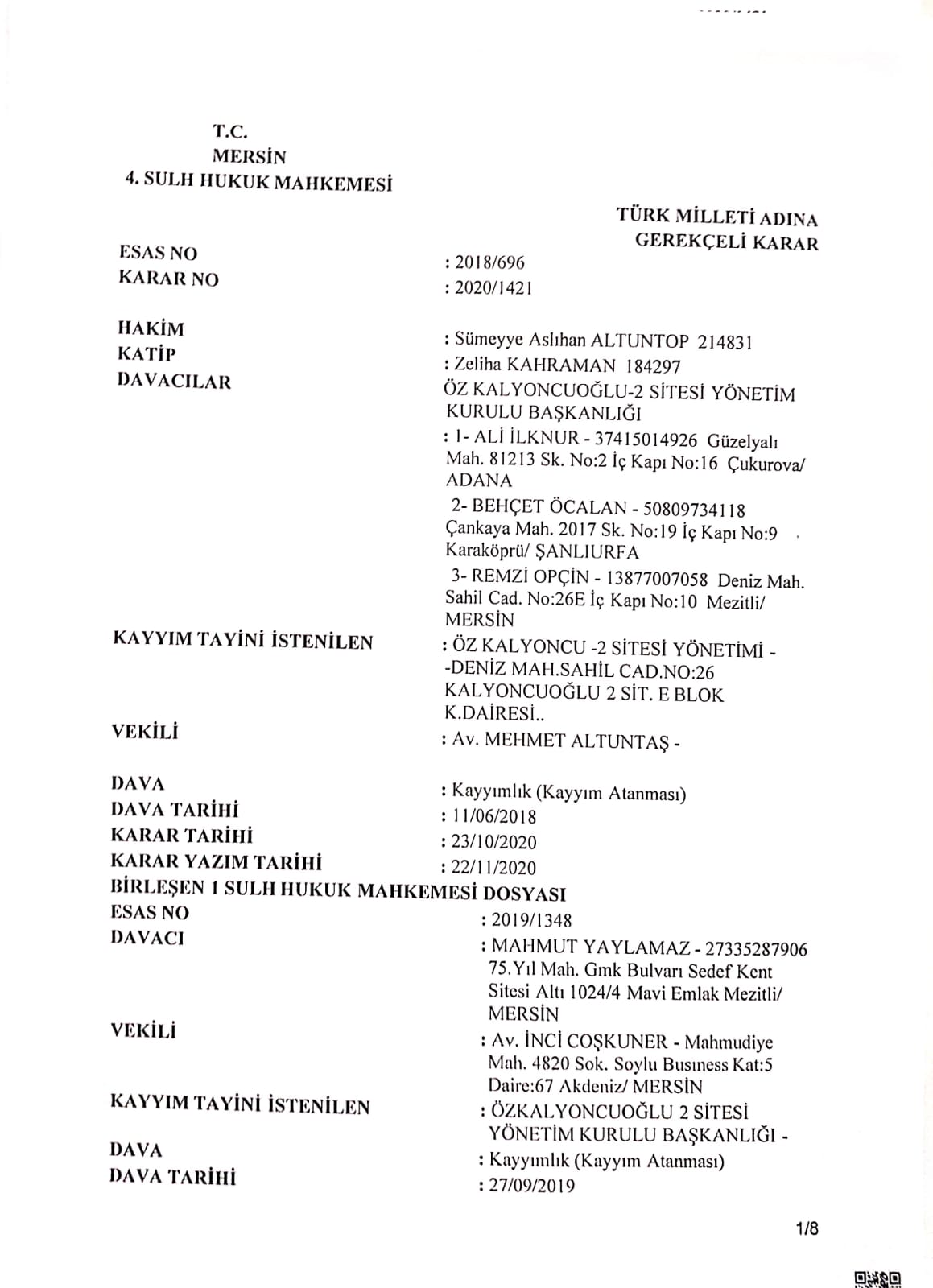 MERSİN 4.SULH HUKUK MAHKEMESİ KARARI İLE YÖNETİCİ SEÇİMİ